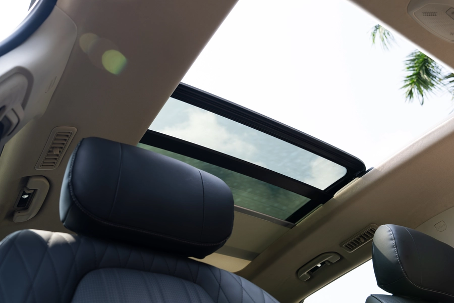 Moving to the second row, you have the option of either a bench seat or two individual captain seats. One thing that feels like a miss, especially for India, is the absence of rear sunshades. Given the amount of glass area in a car of this size, it is something manufacturers should really start including more consistently. Apart from that, you get multiple charging ports, a 220 volt power socket, and a powered tailgate.