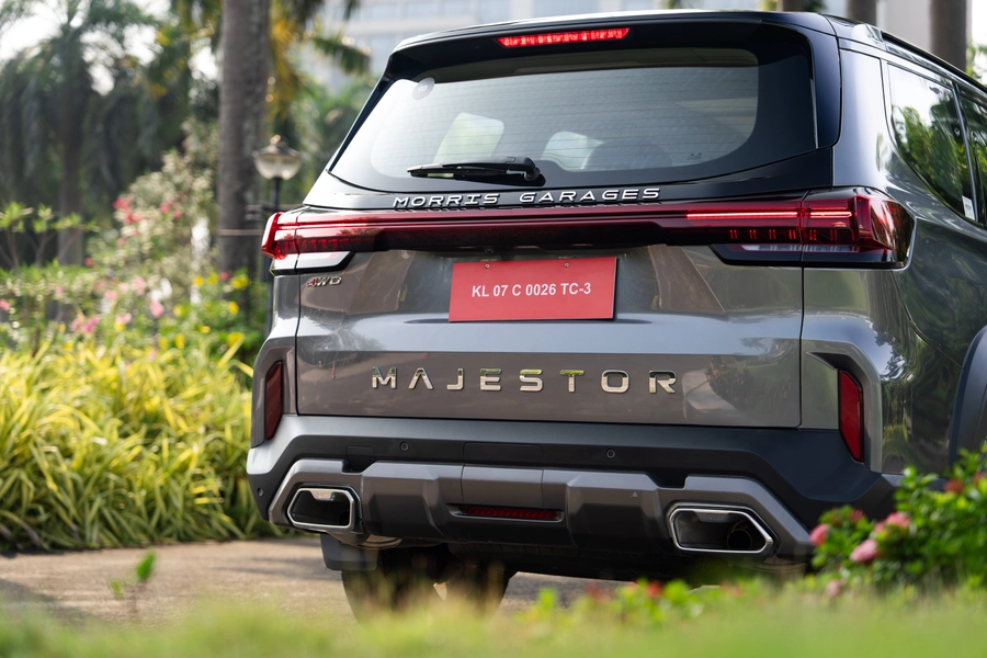 At the rear, you get a connected tail lamp design. Interestingly, you do not see the MG logo here. Instead, you get Morris Garages spelled out, with the “Majestor” badge placed below it. The bumper is chunky with plastic cladding, and you get dual exhaust tips, which look much cleaner than the fake quad exhausts seen on the Gloster.