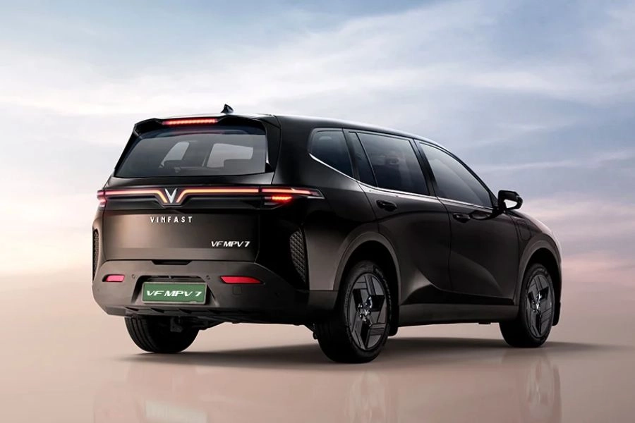 The Vinfast VF MPV7 features a typical upright MPV stance with a focus on space and road presence. It measures 4,740 mm in length, 1,872 mm in width, and 1,734 mm in height, with a wheelbase of 2,840 mm. At the front, the MPV7 gets connected LED DRLs paired with LED projector headlamps. The rear features a connected LED lighting setup, along with a high-mounted stop lamp, rear spoiler, and shark fin antenna.